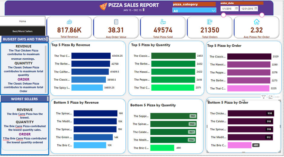 SQL | POWER BI PIZZA SALES ANALYSIS (BEST AND WORST SELLERS PAGE)